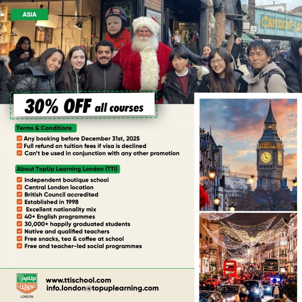 유럽 쪽 비율 높은 TopUp Learning London (Tti)은 현재 한국 학생들을 대상으로 30% 학비 할인의 장학혜택을 제공 중이라서 저렴하게 영어공부가 가능하네요.