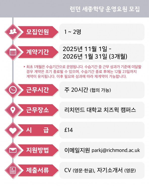 런던세종학당은 Richmond American University London 내에 위치한 한국어 및 한국문화 교육 기관으로, 한국어 수업과 다양한 문화행사를 통해 한국어와 한국문화를 알리고 있습니다. 이번 채용은 행정 및 운영 전반을 지원할 행정 운영요원(Administrative Support Assistant)을 모집하는 것으로, 국제 대학 환경에서의 실무 경험과 문화행사 운영 경험을 쌓을 수 있는 좋은 기회입니다.