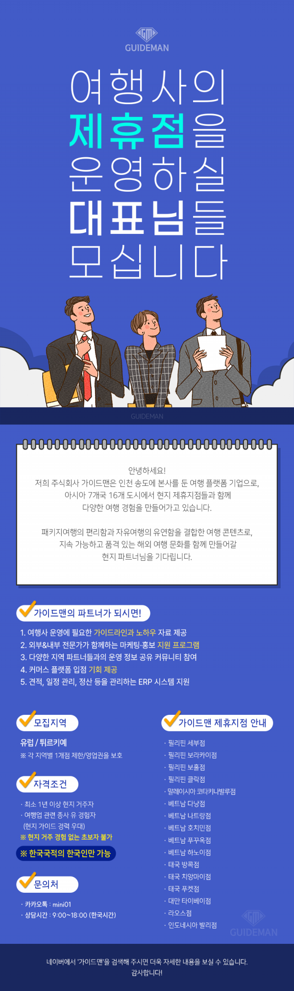 저희가 찾는 분은 유럽 지역을 총괄하며, 현지 가이드 네트워크와 조직망을 운영할 수 있는 대표 파트너입니다.