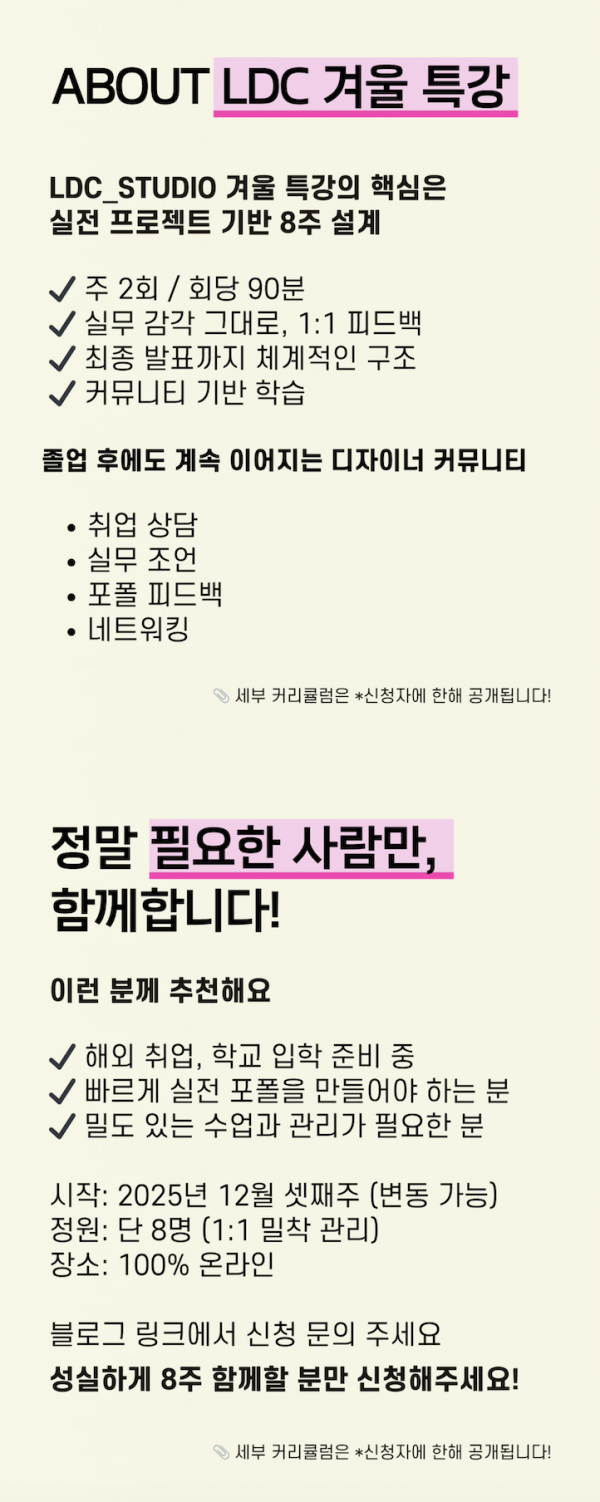 그래서 LDC Studio와 함께 해외 실무 디자이너 출신이 직접 설계한 커리큘럼과 피드백이 필요합니다.