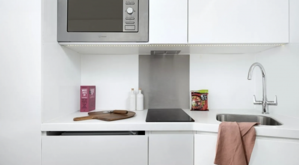 Own kitchen (w/ built-in microwave, induction, sink, fridge) and bathroom