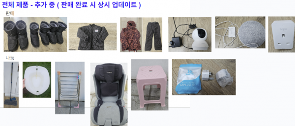 방한부츠(방한화, 겨울 부츠), 어린이 깔깔이, 스키복, 홈카메라, CD플레이어, 스마트 플러그, 대걸레, 좌욕기, 소형 빨래 건조대, 주니어 카시트, 플라스틱 의자, 충전 어댑터