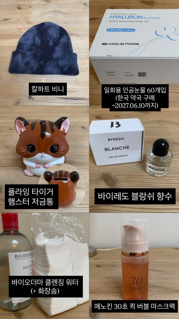 그래마인유스 파랭이, 인공눈물, 칼하트 비니, 메노킨 30초 버블 마스크팩, 바이오더마 클렌저, 바이레도 향수, 핸디형 스팀 …