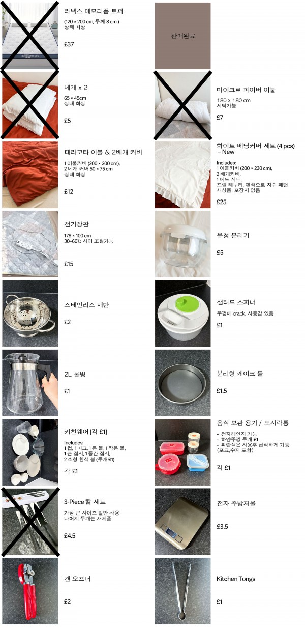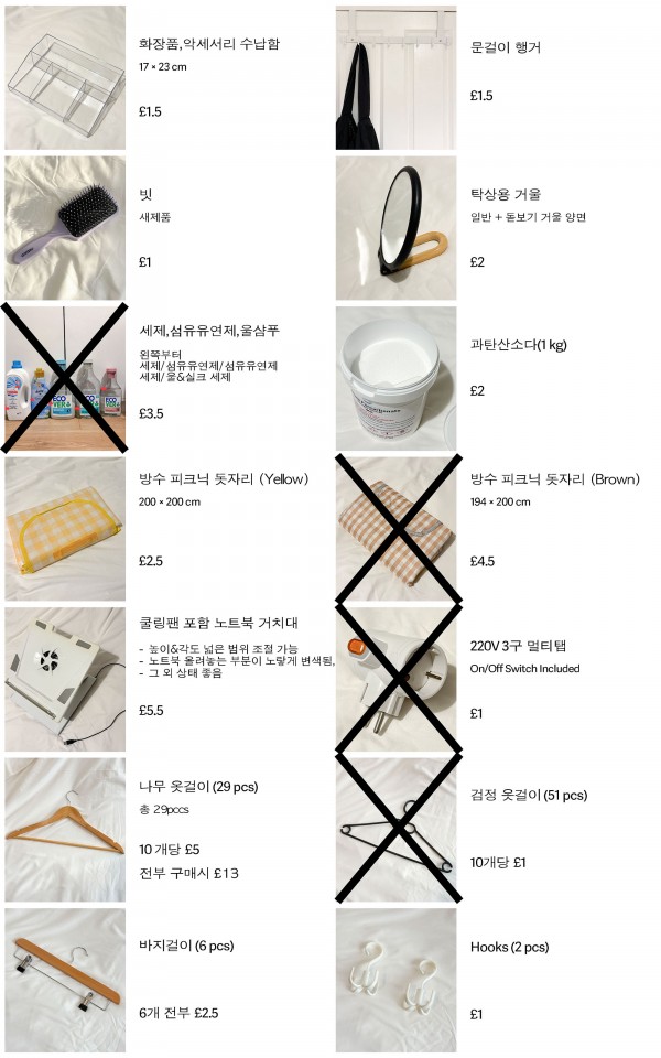 추가물품 : 행잉 열쇠 보관함(£3.5), 스테인리스국자(£1.5), 주방가위(£0.5)