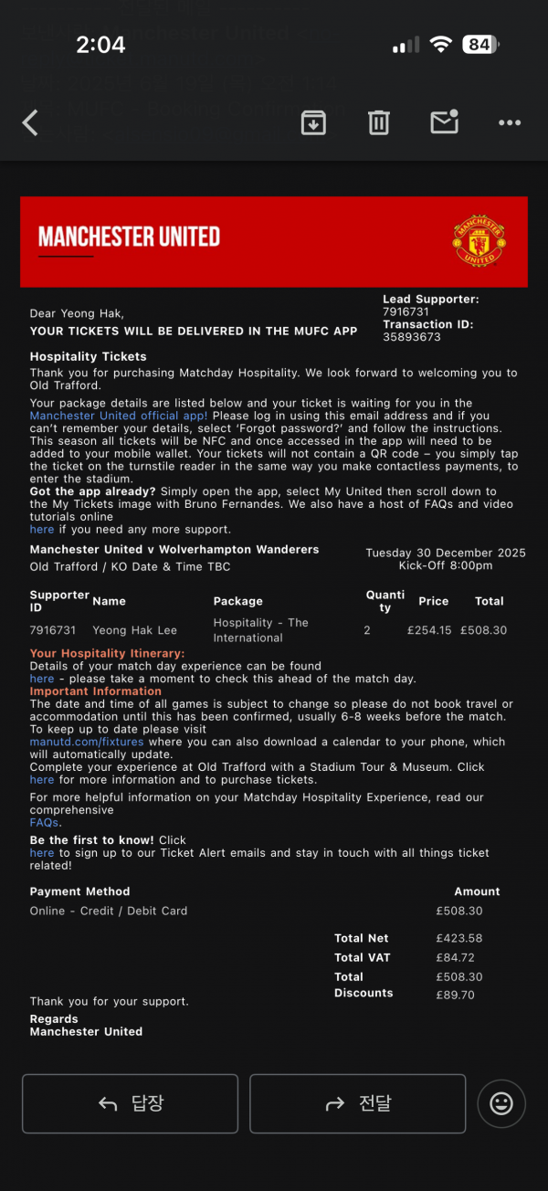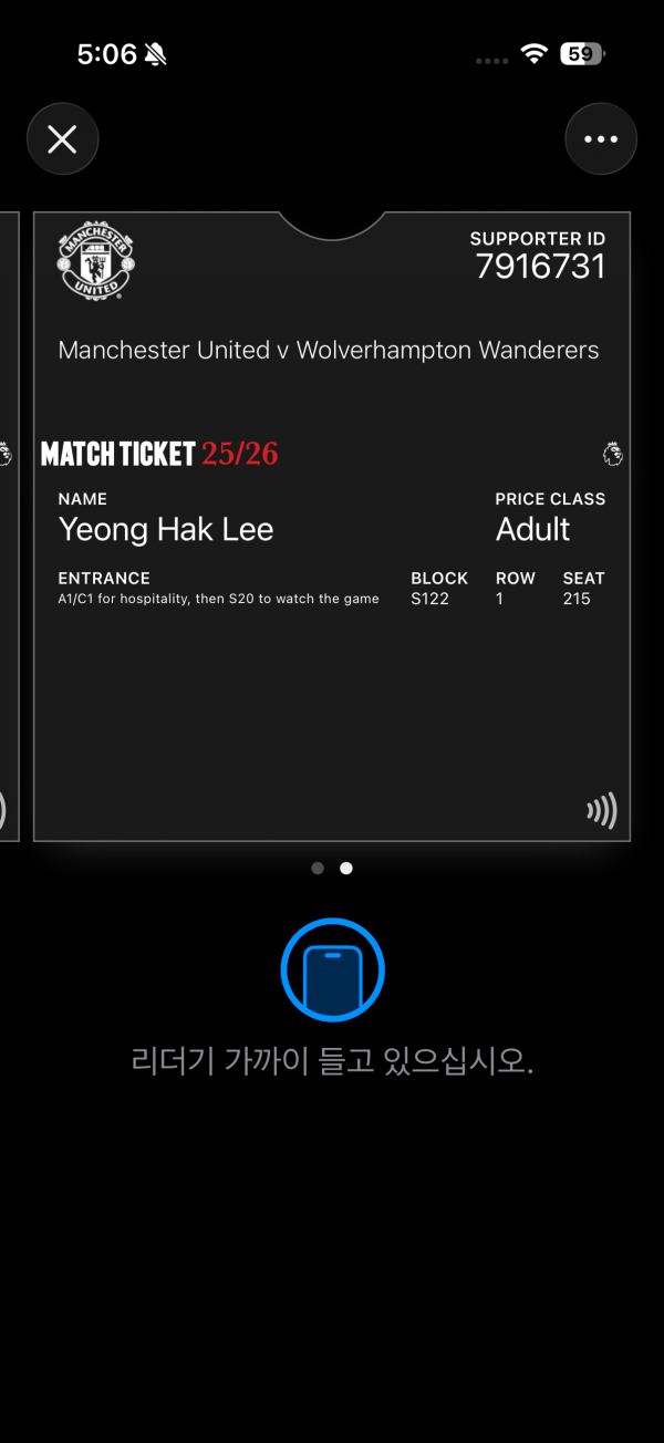 • 티켓 종류 : e-ticket (맨유 공식 사이트/앱에서 구매한 전자 티켓) 2매