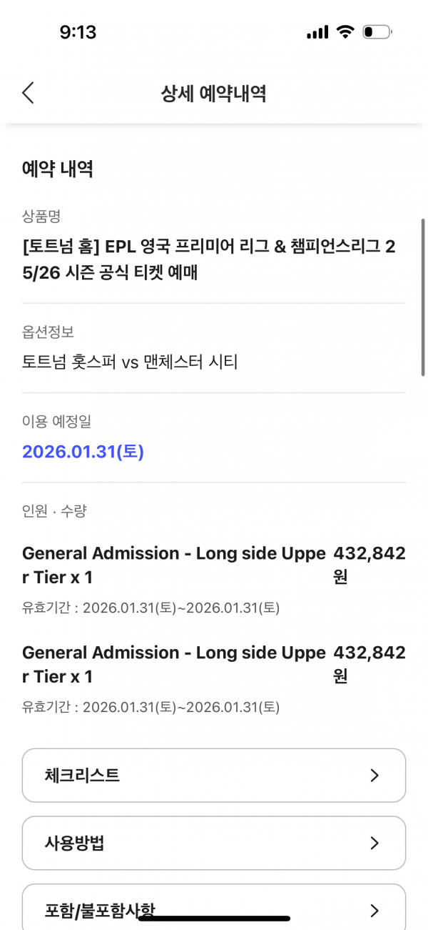 26년 2월 1일 토트넘 vs 맨시티 토트넘 홈 경기 연석 티켓 양도합니다.