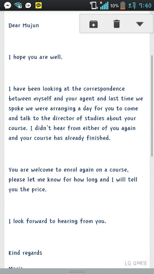 그러나 그렇게 3주가량 학원을 다녔고 저의 학원에 대한 기대가 너무 높아서였는지.. 어학원이 너무 재미도 없고 특히 수업방식이 너무 맘에 들지 않았습니다.. 이건 분명 저에게 문제가 있는 것이었겠지만 그때에는 일도 구해서 시작하고 있었고 학원에 정이 가지를 않아서 잠깐 학원을 멈추고 나중에 다시 아이엘츠 같은 코스로 다시 하고 싶었습니다. 그래서 중경삼림님께 연락을 드렸고 몇 차례 연락을 통해 정지를 해주시겠다고 하였습니다. 그러나 그전에 학원담당자와 만나서 무엇이 문제인지 피드백을 듣고 싶다고 하였고 약속 날짜를 잡았습니다. 그리고 그 약속시간 1시간 전 중경삼림님으로부터 연락이 왔습니다. 오늘 담당자가 없으니 다음 번에 봤으면 좋겠다고 하였습니다. 알겠다고하고 다음 약속이 잡히면 연락을 달라 하였으나 그러고나선 연락이 없었고 그냥 그렇게 어학원 휴학이 제대로 된 줄 알고 런던 생활을 하고 있었습니다.