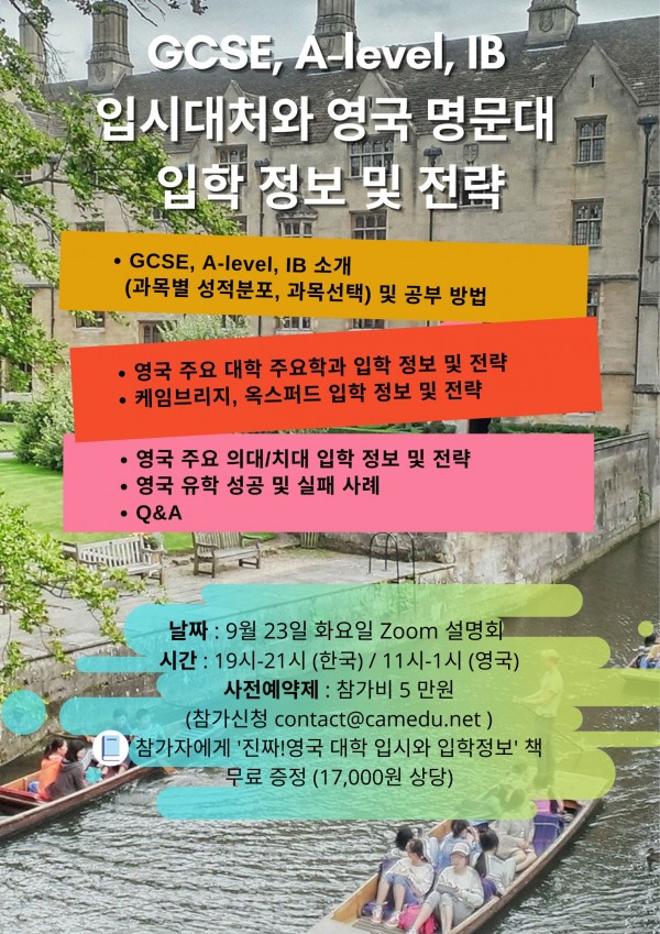 영국 대학 입시 설명회 (온라인) : GCSE, A-level, IB 입시 대처와 영국 최상위권 명문대 입학 정보 및 전략 (9월 23일 화요일)