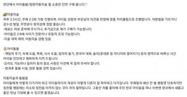 (구직)런던에서 아이돌봄/방문아동미술 할 소중한 인연 구해 봅니다♡
