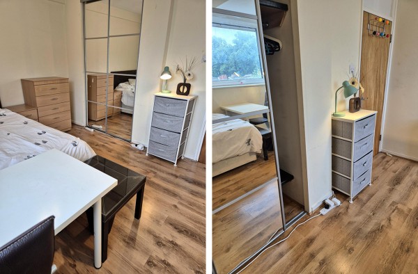 - 전면거울 문의 큰 붙박이장, 서랍장, 책상, 의자, 베드사이드 서랍장, 티테이블