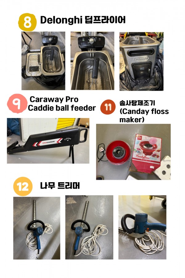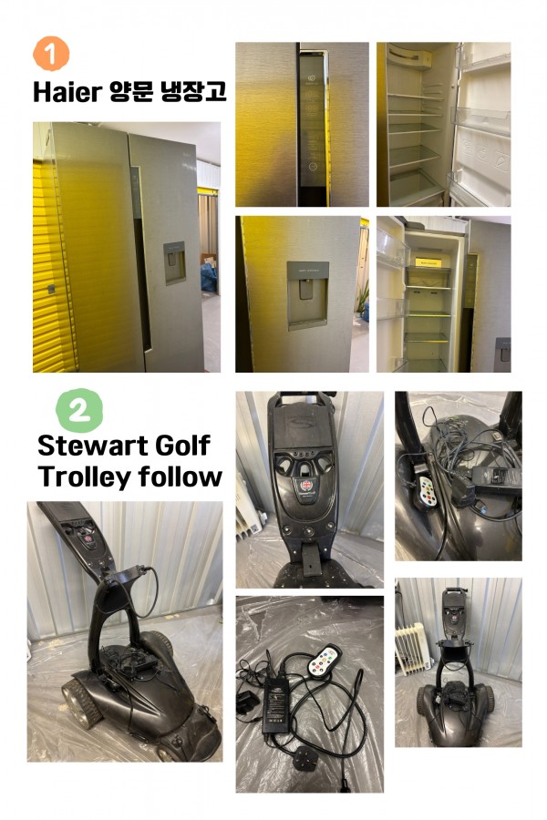 냉장고(양문), 스튜어트 골프트롤리, 골프볼 피더, 짐 벤치, TV스탠드, 히터, 발마사지기, 방수포, 조립식 철제선반, 나무트리머, 솜사탕 메이커 > 가전제품