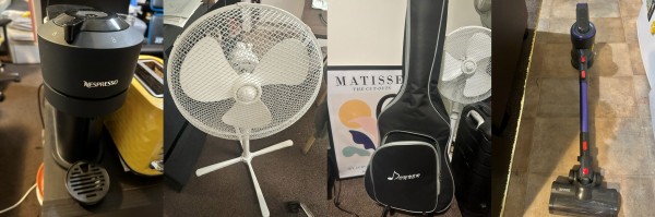 네스프레소 버츄오(£35), 선풍기(£15), 연습용 기타(£25), 무선청소기(£50)