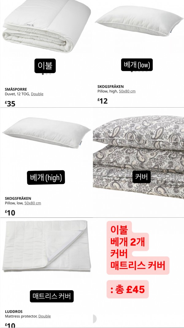 6. 침구류 (이케아 이불+베개2개(커버포함)+매트리스커버) : £45