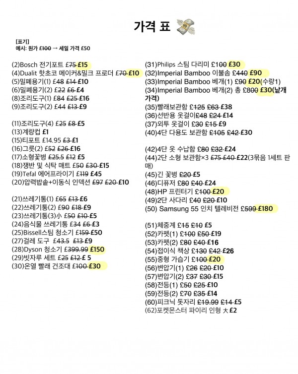 - 가전제품: Dyson 청소기, Samsung TV, Panasonic 전자레인지, Bosch 전기포트, Nespresso 커피머신, Dualit 우유 머신, Tefal 에어프라이어, Bissell 스팀 청소기 & 카펫 청소기, HP 프린터, Philips 스팀 다리미