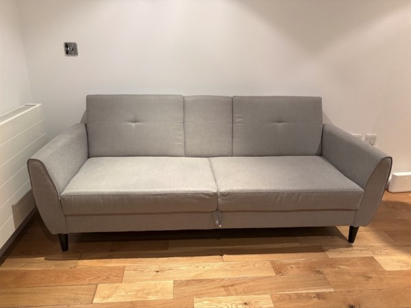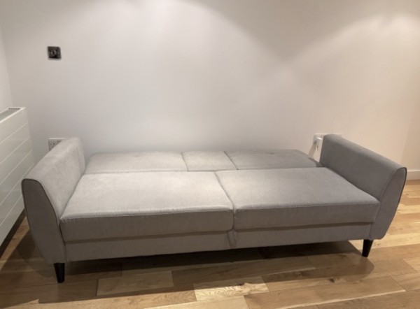 * 설명: 패브릭 소파베드이고, 옅은 밝은 회색으로 차분한 느낌입니다. 하단의 나무 다리 Brown 색깔과 패브릭의 옅은 Grey 색깔이 서로 잘 어울려요. 손님왔을 때 펼쳐서 침대로 사용하기에도 튼튼합니다. 와서 보시고 사진과 다르다고 생각되시면 안 사셔도 괜찮습니다. 편하게 문의주세요