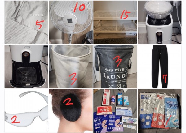 한국 칫솔 4개 묶음 / 접이식 아코디언 의자 / 소매치기 방지 스트랩, 와인따개, 옷핀, 집게 등 / 이불 및 베개 커버 2개 / 메디폼 여드름 패치 / 키미테