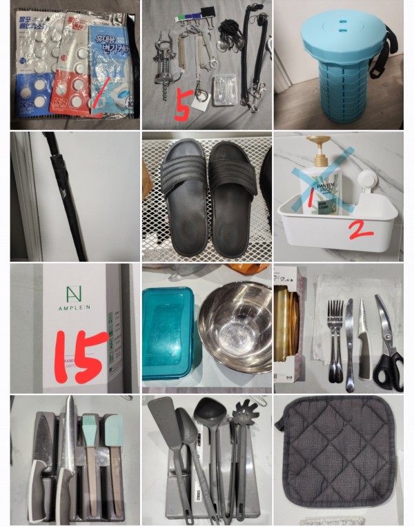 비오킬(살충제) / 접이식 아코디언 의자 / 와인따개, 옷핀, 집게 등 / 이불 및 베개 커버 2개 / 메디폼 여드름 패치 / 키미테