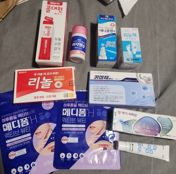 콜대원/이지엔6이브/티눈약/메디폼/뿌리는 상처치료제/리놀/키미테 및 멀미약/멍연고/화상연고/지르텍/버물리/변비약/타박상연고/후시딘/마데카솔/노스카나연고/해열소염진통제/알러샷/리도멕스연고/눈 다래끼약(레보틴/후메론) 등