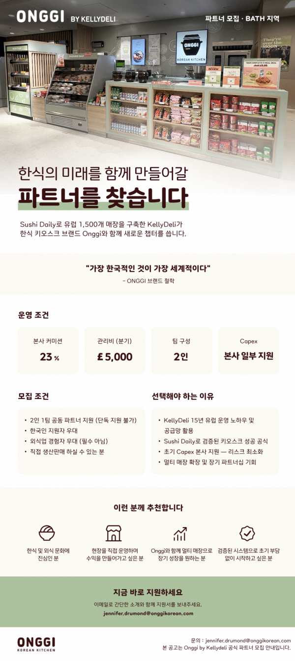 KellyDeli의 한식 브랜드 Onggi가 런던 Waitrose 오픈 이후 큰 사랑을 받으며, Bath Waitrose 지점에 프렌차이즈 파트너를 찾고 있습니다.