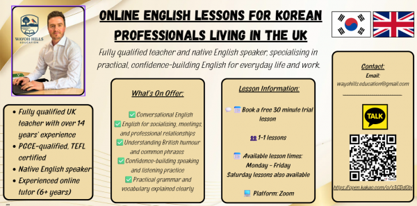 저도 한국에서 생활하고 일한 경험이 있어, 한국 학습자들이 실제 상황에서 영어를 사용할 때 겪는 어려움을 잘 이해합니다. 또한 런던에서 오래 거주하며 일한 경험을 바탕으로, 영국 직장과 사회에서 실제로 쓰이는 표현과 문화를 중심으로 수업을 진행합니다.