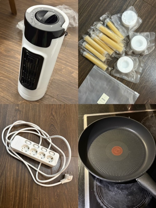책상, 베드테이블(사이드테이블), 선풍기, 한국멀티탭, 샤워기필터, 후라이팬, 델 모니터