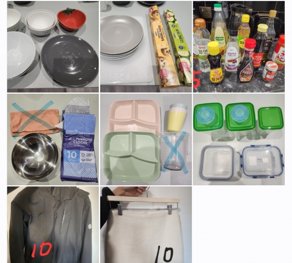 이사 택배 상자(52×52×40) / 압축팩 대형 / 컵, 행주, 도마, 냄비 받침, 수세미, 반찬통, 빵칼, 수저통 등 / 발포 구연산, 베이킹 소다 및 휴대용 변기 커버