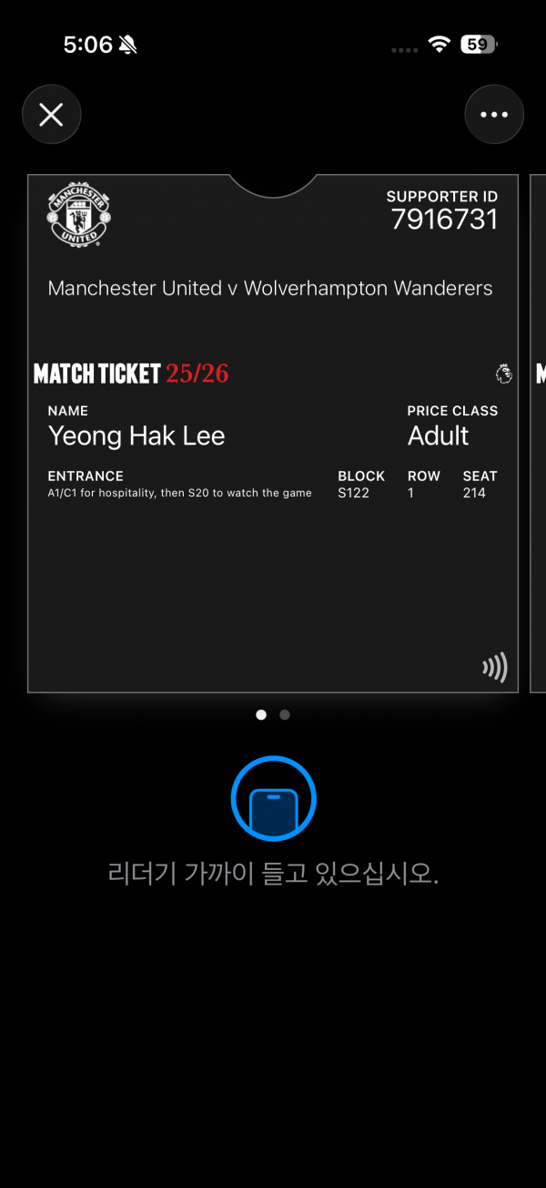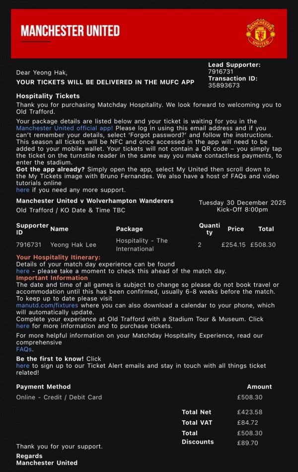 • 티켓 종류 : e-ticket (맨유 공식 사이트/앱에서 구매한 전자 티켓) 2매