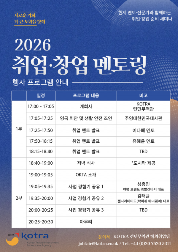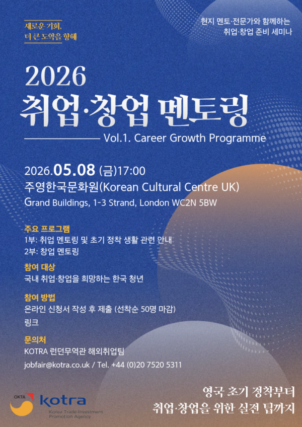 2026 취·창업 멘토링 행사가 오는 5월 8일 금요일, 런던 소재 주영한국문화원에서 개최될 예정입니다.