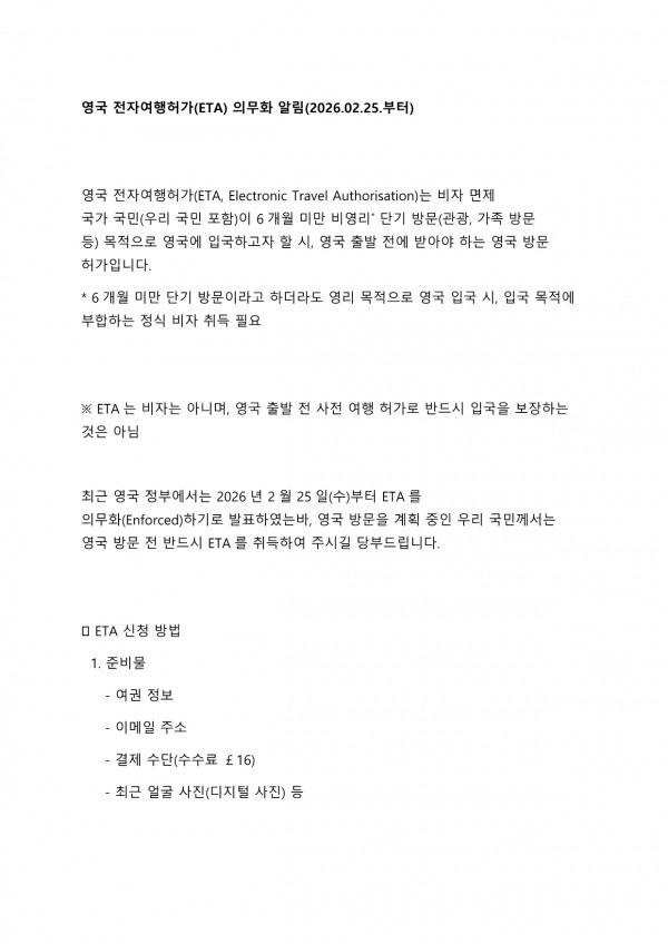 영국 전자여행허가(ETA) 의무화 알림(2026.02.25.부터)