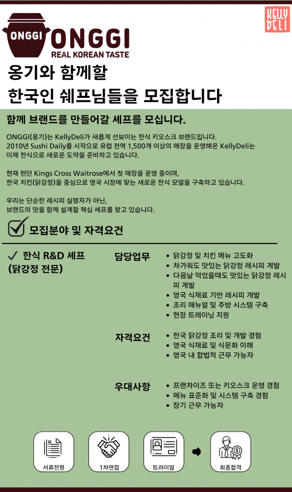 [켈리델리] Kelly Deli Korean Brand 옹기[Onggi]에서 닭강정을 개발해주실 쉐프님을 모집합니다