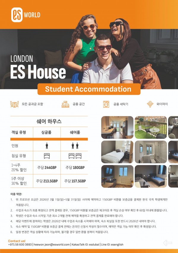 ►존 1, ES 런던 영어학원-전주차 수강료 20% 할인 | 쉐어 하우스 30% 할인/홈스테이/레지던스◀︎