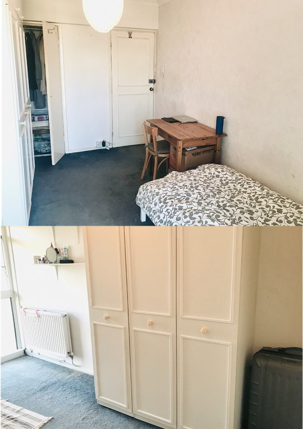 방은 꽤 넓은 편이고 수납 공간이 많아서 좋아요. (옷장 + 벽 뒤 수납공간)