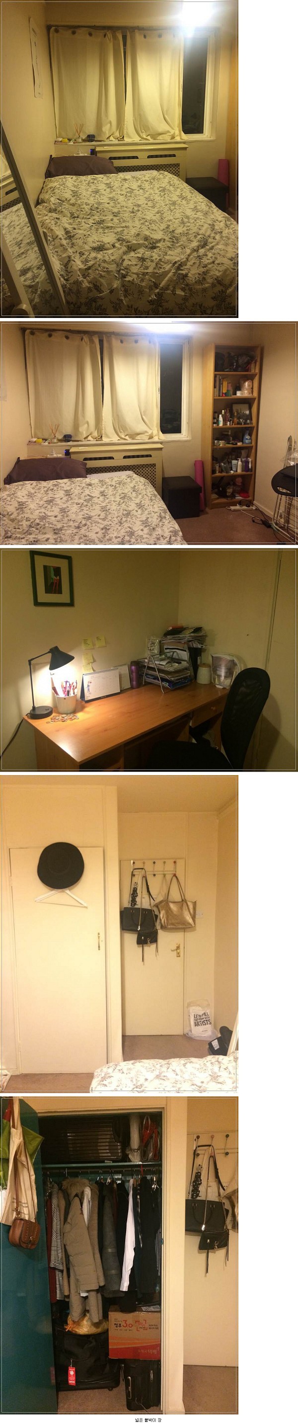 방에는 작은더블침대, 책장, 책상, 붙박이장, 전신거울 등등 구비되어 있습니다.