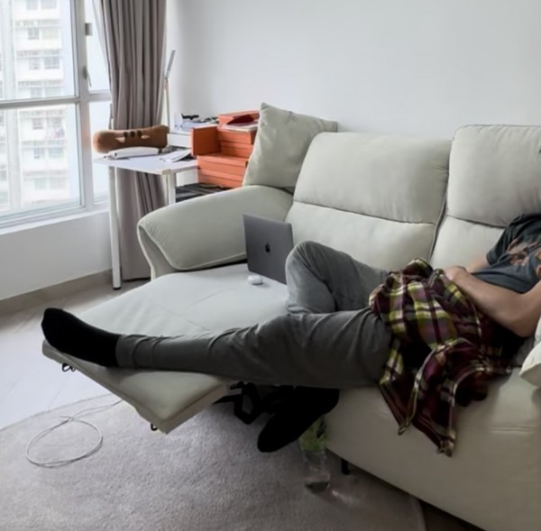 옆에 핸드폰 충전기 가능한 리클라이너 소파입니다. 리클라이너는 사진에 보이는 것 처럼 한쪽만 가능합니다.