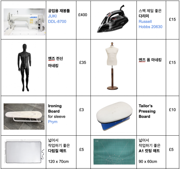 주키 공업용 재봉틀, 마네킹, 다리미, 컷팅매트 등